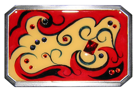 Crazy and funky is the best way to describe this one. The design is simple yet jazzy and it crystals are a big part of the background painting. I found this rectangle crystal and had to add it to a masterpiece. The Swarovski Crystals are set into the glaze for a secure fit. The crystal colors are a mix of ruby red and deep blue. Measurements: 3.75 x 2.5 inches This buckle can be added to a belt strap you already have or you can add a belt strap for and additional $20. Click here for belt strap options