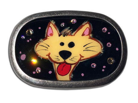 Best Cat Ever! You know it is! Hand painted acrylic on metal buckles. The Swarovski Crystals are set into the glaze for a secure fit. The crystal colors are a mix of light pink, light yellow and clear crystal. Measurements: 3.5 x 2.25 inches Click here for belt strap options. The addition of the strap is free! |