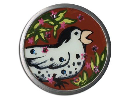 Blue Bird. Hand painted acrylic on metal buckles. The Swarovski Crystals are set into the glaze for a secure fit. The crystal colors are a mix of royal blue, blue/red topaz and light pink. Measurements: 2.9 inches Click here for belt strap options. The addition of the strap is free! |