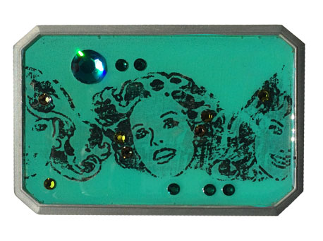 Dancing Queen. Because you know you are one. And that hair... Hand painted acrylic on metal buckle with image transfer. The Swarovski Crystals are set into the glaze for a secure fit. The crystal colors are a mix of aqua and olive green. Measurements: 3.75 x 2.5 inches Click here for belt strap options. The addition of the strap is free!