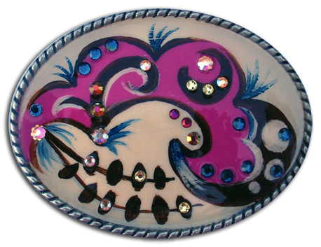 The beige background gives this design a perfect launching pad. The hot pink with the dark blue seem like an unexpected color combo but I think it's perfect with the brown sprigs with little pods on them. The Swarovski Crystals are set into the glaze for a secure fit. The crystal colors are a mix of deep blue, light yellow mirrored gold and hot pink, purple and clear crystal flower shaped crystals. Measurements: 3.5 x 2.75 inches This buckle can be added to a belt strap you already have or you can add a belt strap for and additional $20. Click here for belt strap options. |