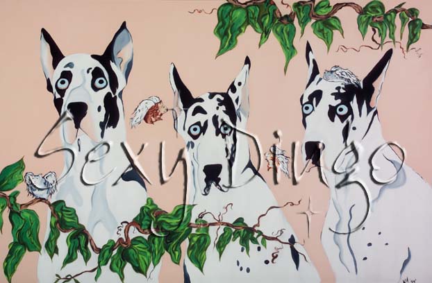 Do You Hear That? I had many pets growing up. It was always so hard when one of them died and I always swore that I never wanted another pet because I could not stand the pain. Of course I always got another one. Before I started this painting I contemplated what animal afterlife was all about. Maybe our past pets are guardian angels to our living pets.Maybe out pets can hear those little angel voices. If so, this is how it all shakes down. Medium - Oil Original Painting Matted Print - 16 x 20