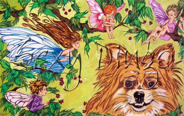 Harry's Fairies Harry is my first precious boy. He is a Sable Pomeranian and he is so smart, sweet and loving that I can't even stand it. He is the best! When Harry was about 4 years old, he chewed into the cord of a lamp. He was electrocuted for a few seconds but we rescued him quickly and he was totally o.k. But sometimes I think that since then he sees little fairies flying around and teasing him. Medium - prismacolor Original Painting Matted Print - 16 x 20 |